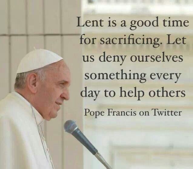 I begin this Lenten season as always‚ hopeful that in the midst of my selfishness and struggles that the Lord will bring me closer to him and to a place of greater peace and joy. I always struggle with what to do during the Lenten season to allow this to happen. What can I do that will open my heart to be transformed? What will make a difference and open me to God's presence? I read the above quote by Pope Francis recently and was inspired to think about Lent a little differently. Maybe this Lent we are called to get outside of ourselves and think about what is happening to others as a result of our behavior and not so much about how everything is affecting "me". I think if we would focus on others and how we can serve; the Lord will do great things in our own hearts as a result. So, this Lent I am not giving up chocolate‚ I am going to take the challenge of Pope Francis and try to serve another every day. I am seeing this beautiful liturgical season as an opportunity to grow and get outside of myself. I encourage you too to make this a meaningful Lenten experience and try to serve others in a new way. Let us pray for each other during this Lenten journey and join me in seeing just what God can do.