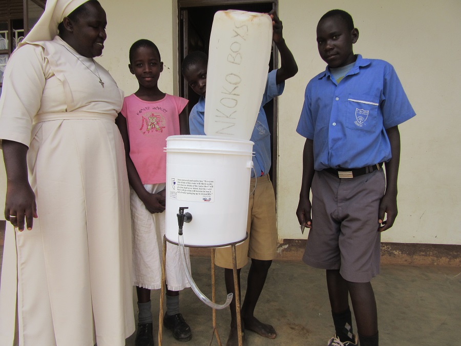 Yet, thanks to the generosity of many CARITAS sponsors and donors, clean water is slowly becoming more accessible to students and their families in Nkokonjeru. This change is the result of dozens of H2MicrO water filters, which have been distributed to households and schools, like St. Paul's, in the area. The filters make a difference in the lives of students and families by giving them quicker, easier access to clean water in their schools and homes. Water that passes through the filters, which sit in simple five-gallon buckets, is safe to drink - no firewood or boiling required.